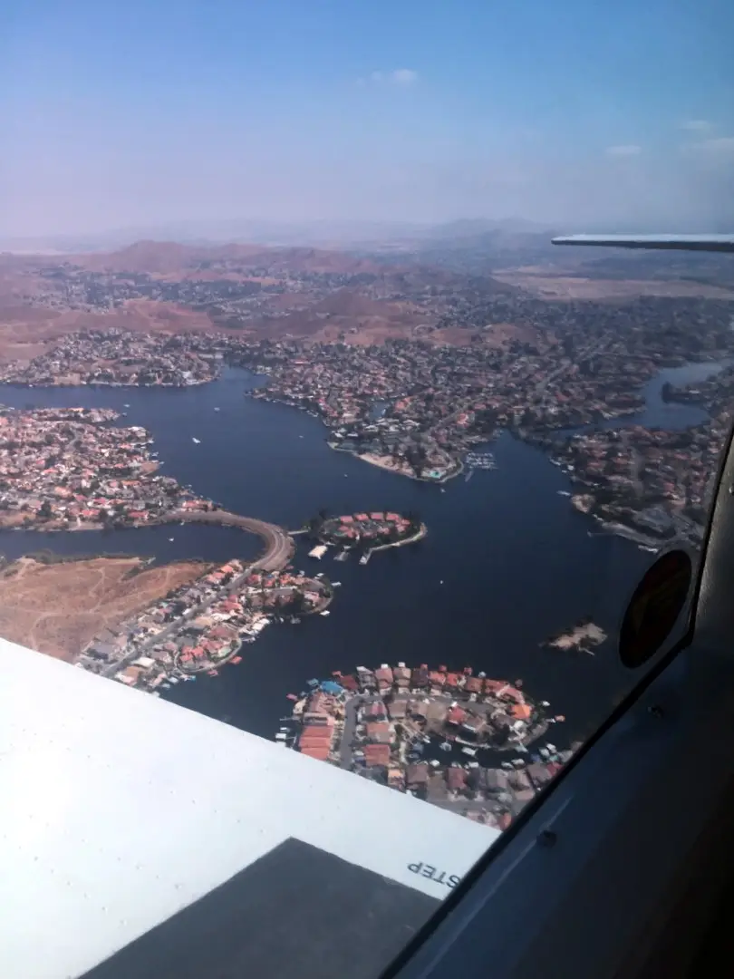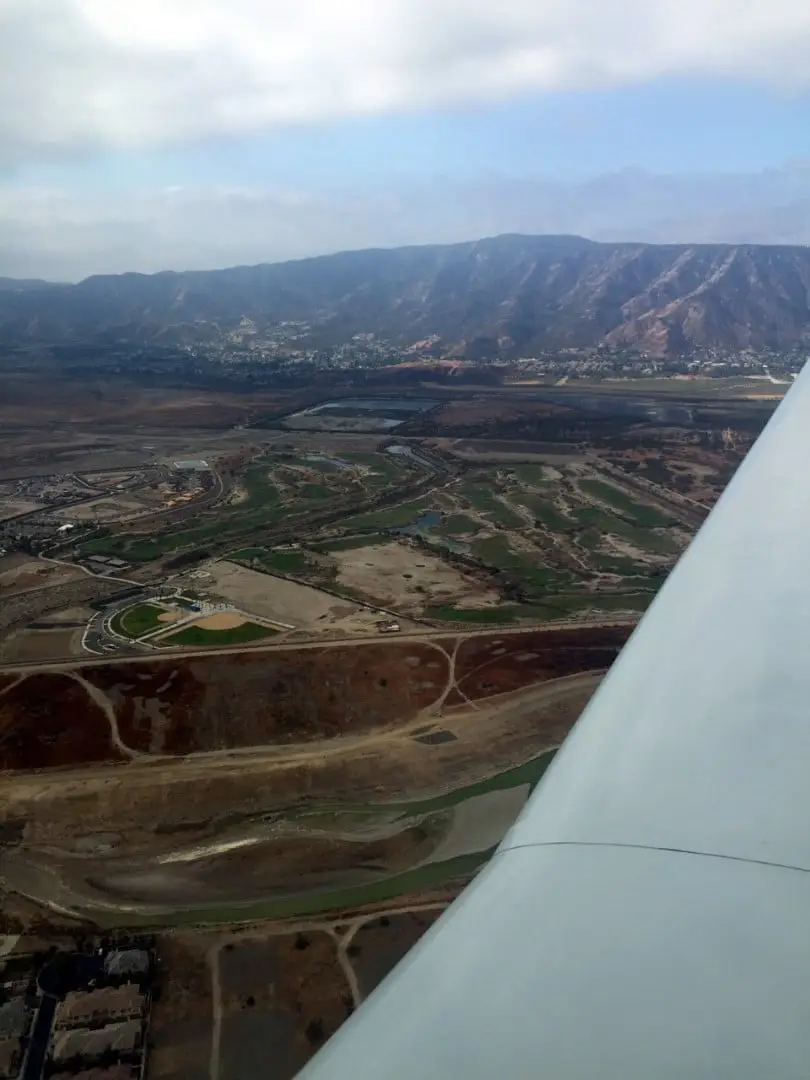 As we approached the southern end of the valley where the hills begin rising and interstate 15 heads through a pass between a couple of 2,400′ hills I made my decision to divert and began a shallow left banking turn. As we turned I told my friend that we were going to go to French Valley instead and have breakfast there. (Borrego Springs, while reporting clear skies, was not an option because we wouldn’t be able to climb high enough to get over the mountains en-route. Later over breakfast as we were talking about the flight and the decision to turn back he said that as we were flying along he was wondering if I was going to turn back and when that would be.