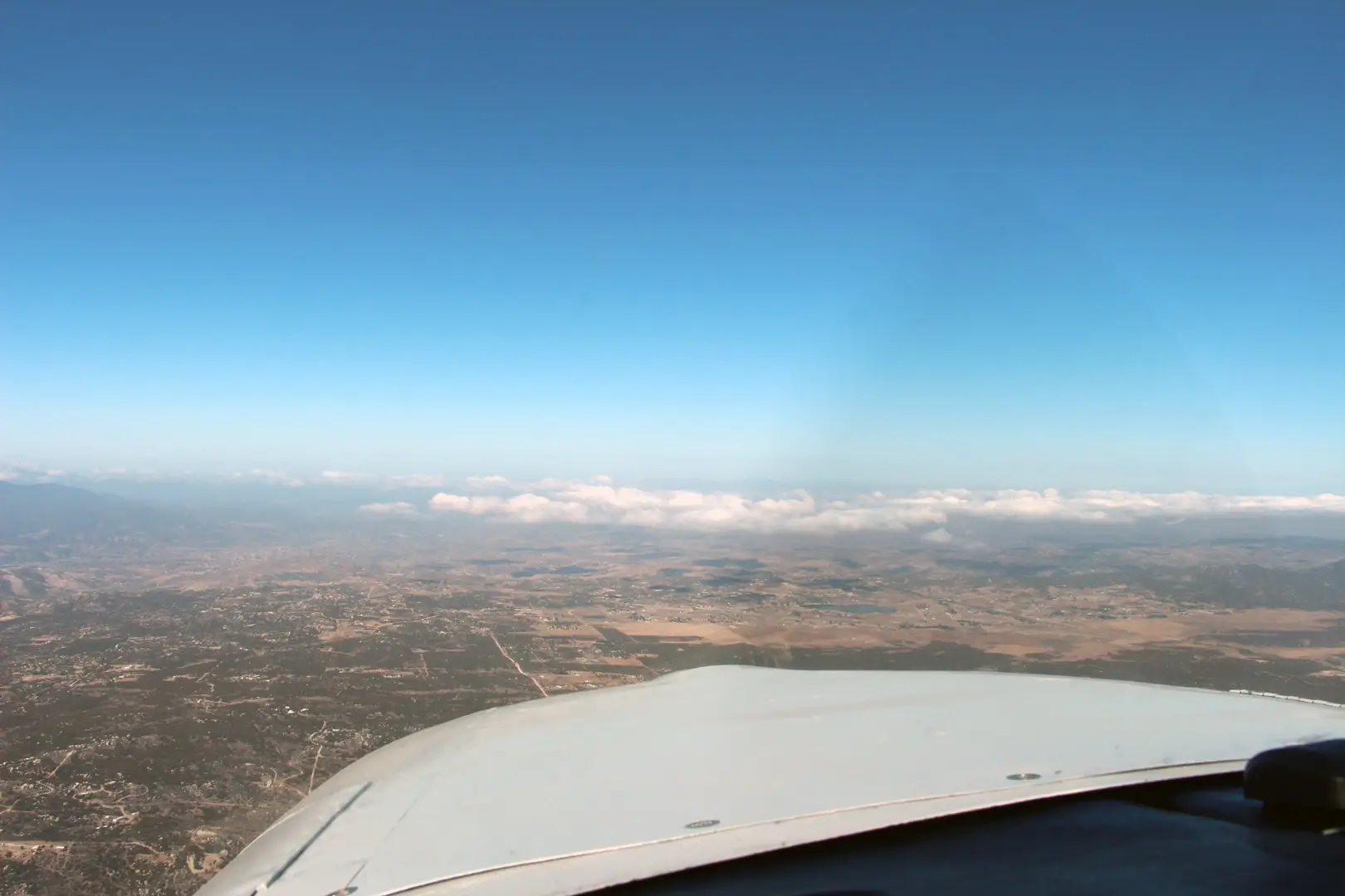 After once again setting up my flight on the tablet I took off on 26, turned crosswind, and then downwind without decreasing my climb rate. By mid-field I was at 2,200′ (Traffic Pattern Altitude is 1,518′) and turned north crossing over the field before heading off to the north-west. A short climb to 6,500′ and I settled in for the short flight back. There were some patchy clouds that I was flying above, but I knew that I would need to get below. Corona was showing clear, but I didn’t know at which point between French Valley and Corona it would go from “Scattered” to “Clear” and I didn’t want to arrive close to Corona with 6,000′ to descend. As I approached French Valley I saw a big break in the patchy clouds so I pushed the nose over to head down through it and under the clouds ahead.