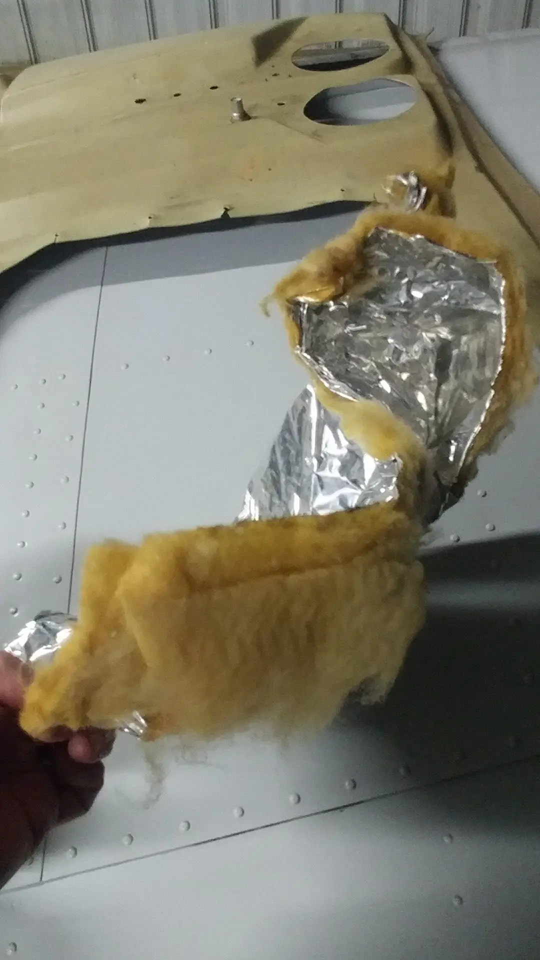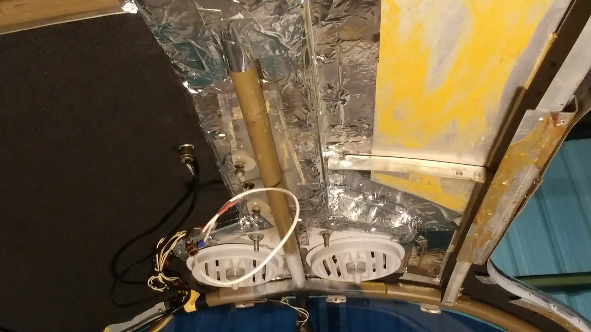 Another thing I have wanted to get done for quite some time is to repair the overhead vents. There is a duct that runs from the inlet in the roof above the rear seats to the four overhead vents. However it is made up of pieces of sheet metal and over the years they just don’t fit well together anymore. I pulled the headliner out and sure enough there were a lot of gaps, with a huge one at the front. Repairs were made pulling off old foil tape and replacing with new tape. The old fiberglass insulation was replaced with super soundproofing closed cell sheets.