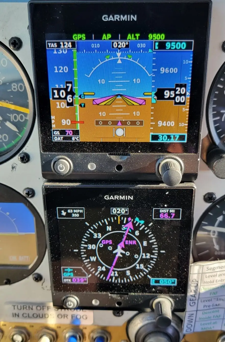 We enjoyed some nice lift for a few minutes while in the updraft side of the mountain wave and leveled off at 9,500’, and then we were in the downdraft side. It was surprisingly smooth, but we struggled to maintain altitude with our IAS dropping to 106 mph. My wife looked at the tablet in front of her and pointing to the distance to the next waypoint asked, “Is that our ground speed?”