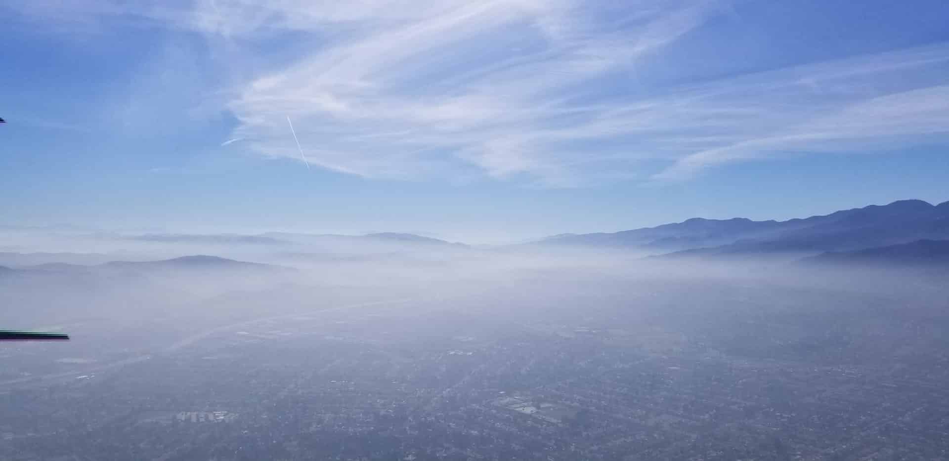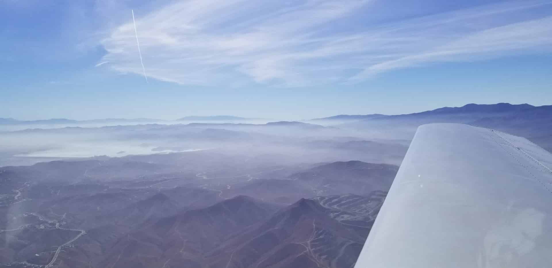 As we taxied down and performed the run-up the skies were blue, but the AWOS (Automated Weather Observing System) was still reporting 2 miles visibility from the haze. However, that didn’t stop an experimental from departing followed about 5 minutes later by two more. The haze was slowly clearing and soon I was just able to make out the hills to the west that are just a little more than three miles away so I announced that we were taking runway 25 for a left downwind departure. By the time we were turning downwind we were above the haze with better than 50 miles visibility.