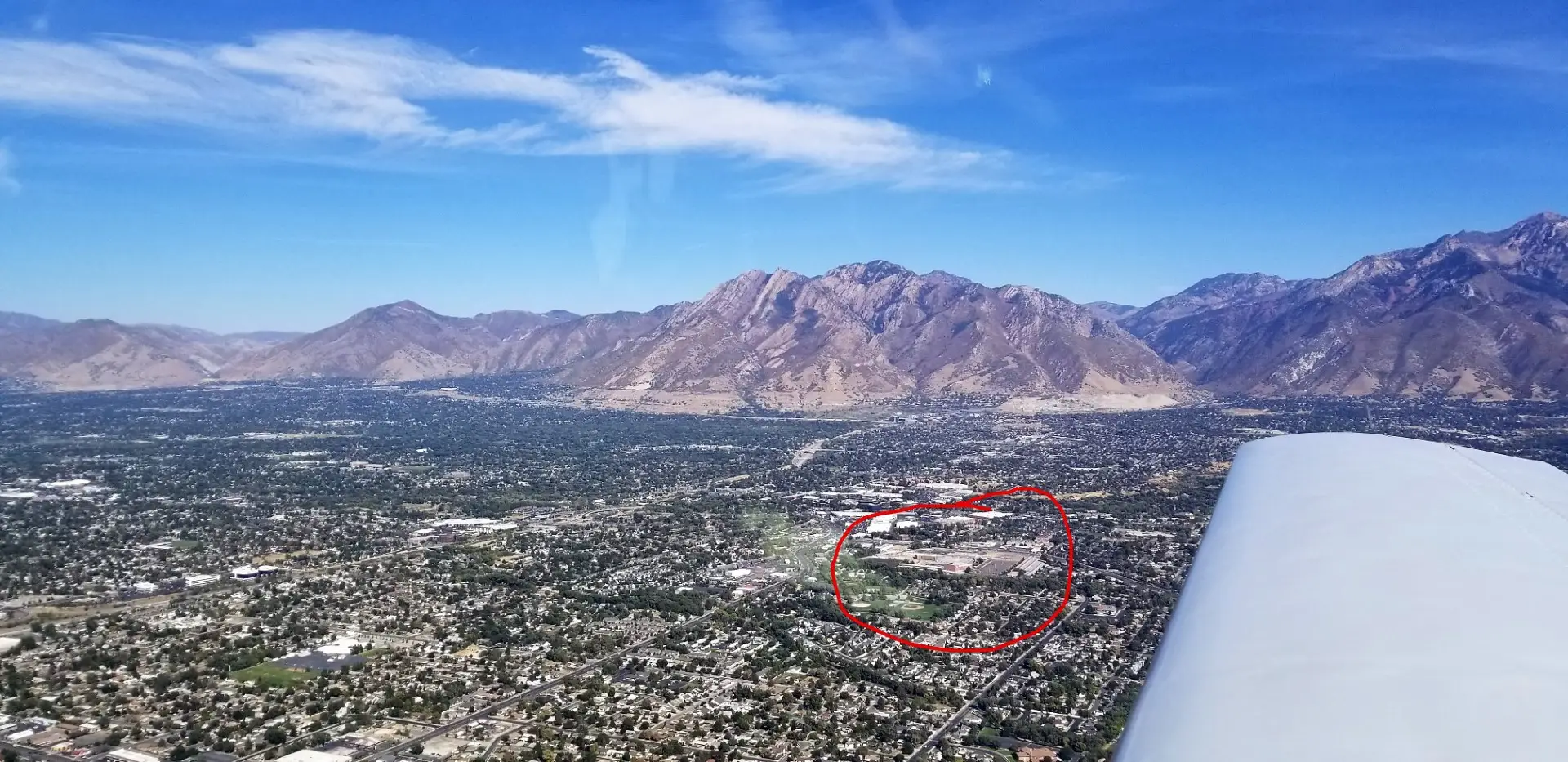 After fueling up we took off and headed north again climbing enough to clear the mountains through the pass. Once over Utah lake we picked up flight following from Salt Lake Approach so that we could also get Bravo clearance along the VFR Transition route over I-15 on our way to Skypark (KBTF). As expected we were assigned 6,000′ and told to remain over I-15. It was really neat to fly along there, I tried looking for Flat Iron Mesa Park to see if I could pick out our old house but making sure I maintained the assigned altitude and course I couldn’t pick it out from all the other parks. I was able to spot my Hillcrest High School where I graduated from (a long time ago) and we saw The Salt Lake Temple, Conference Center, and the State Capital.