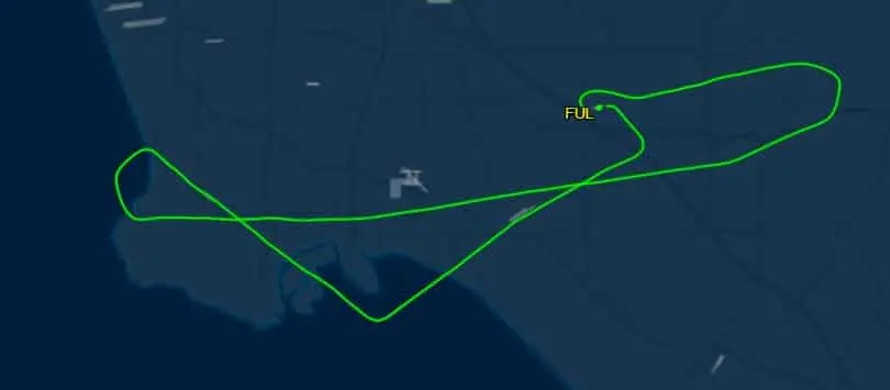 We headed back east and got a new squawk from ATC and requested the RNAV for runway 24 into Fullerton. ATC gave us vectors to fly and we picked up the final approach course about five miles before the Final Approach Fix where we were handed of the KFUL Tower. They were still using runway 06 at KFUL so we flew down to the MDA (Minimum Descent Altitude) of 900′ before he took the plane so that I could take the foggles off. There was runway 24 right in front of us (much further away than the LPV minimums at KTOA) and we circled around for left traffic to land runway 06.