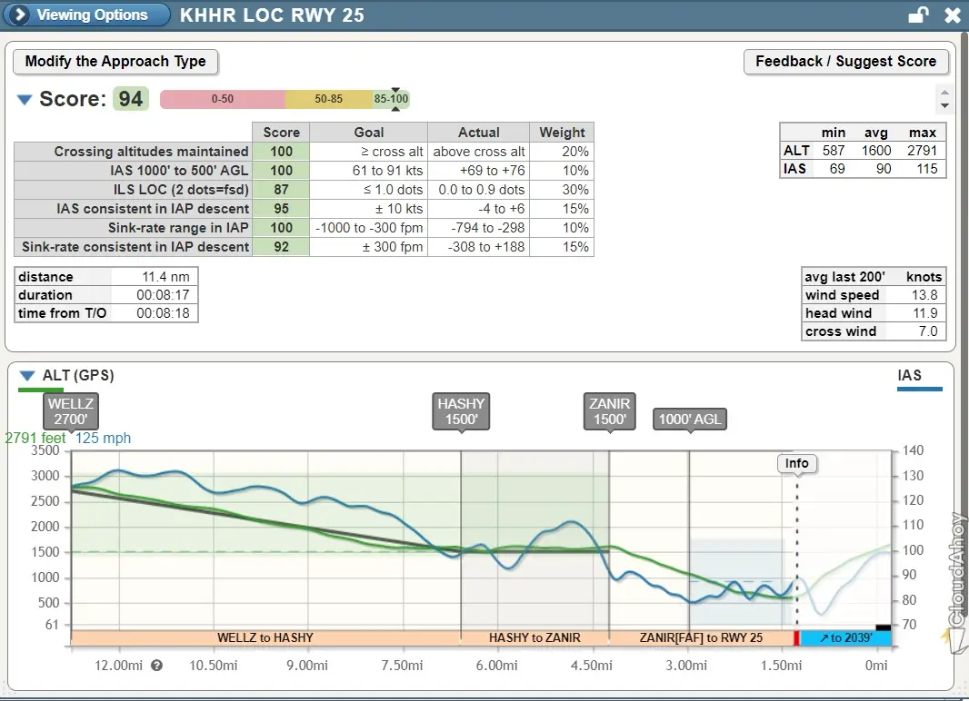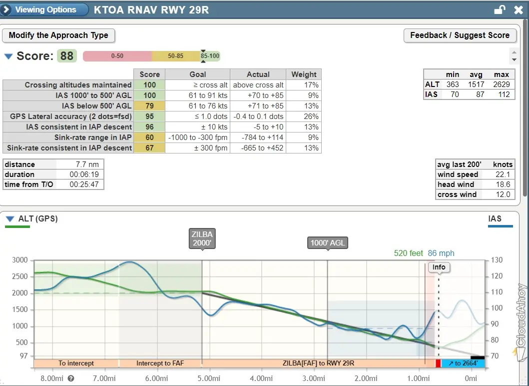 The tower handed us back to SoCal and I asked for the RNAV RWY 29R practice approach into KTOA. ATC vectored us out and brought us in on the final approach between (IF) DRIFY which is an Initial Fix and (FAF) ZILBA the Final Approach Fix. The winds at KTOA on the ground were similar to KHHR, 270° at 12 knots gusting 20 knots, however as we were coming down final the winds between 2,000 and 1,000′ AGL were showing as 270° at 29 knots and required a fair amount of crab angle to stay on centerline. The approach was not as good as the previous one at KHHR but was still scored a respectable 88 by Cloudahoy.