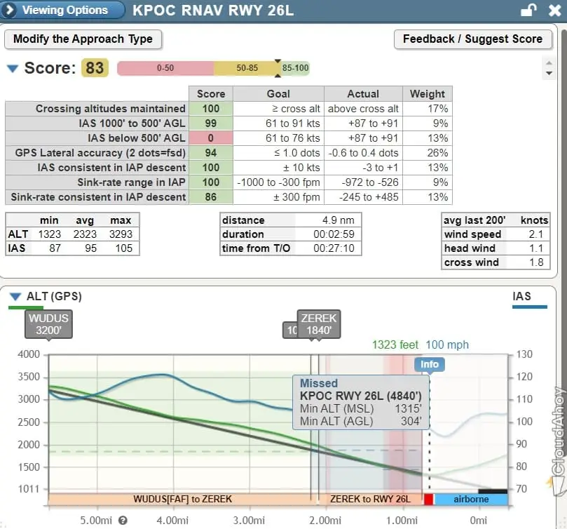 After going missed we were handed back to SoCal and vectored to the east to intercept the RNAV 26L approach. The only thing I got dinged for in the Cloudahoy debriefing was my speed below 500′ AGL, but with the DA at 300′ AGL and going missed my speed was higher than the approach wanted below the 500′ AGL mark. After going missed we went back to fly the RNAV RWY 24 approach back into Fullerton (KFUL) which was a little sloppier than the other approaches.