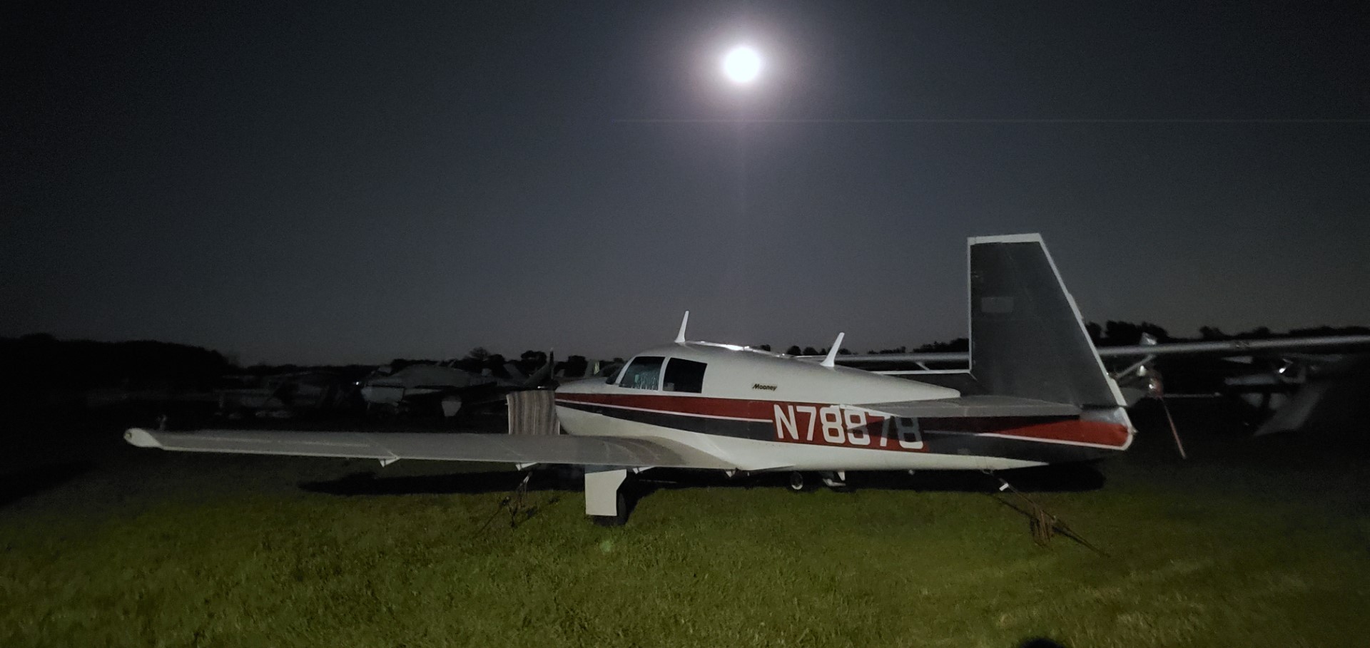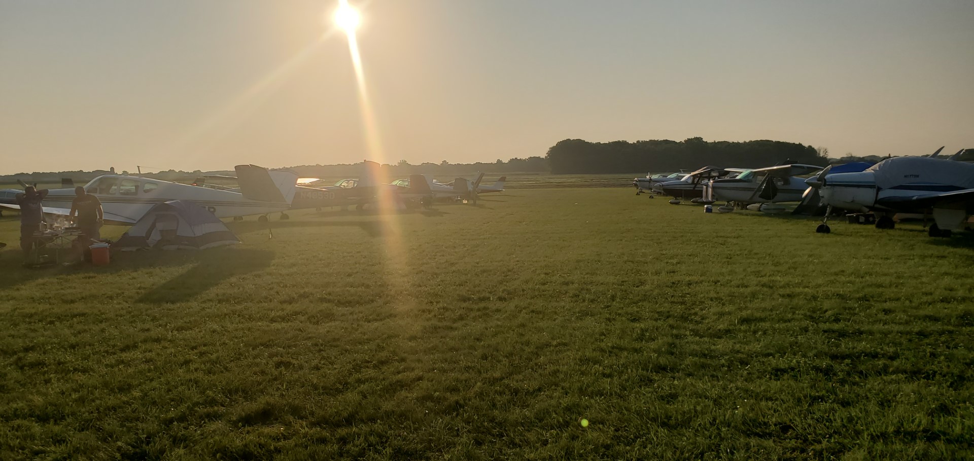 We were fairly well sheltered by the tree line and our tent was tucked up by the plane so after going outside to grab the towels off the prop so they wouldn’t be lost we went back to sleep. About an hour later (2:30am) we woke up to more sound from the loudspeakers and the text alert on my phone read “OSHALERT: 7/27/21 – Another round of storms headed for OSH @ around 4:40 am. Heavy rain & 30-45 mph winds expected w/possible lightning. Please take precautions.” Having ridden out the earlier storm we went back to sleep, and I didn’t wake up again until the sun was coming up over the horizon.